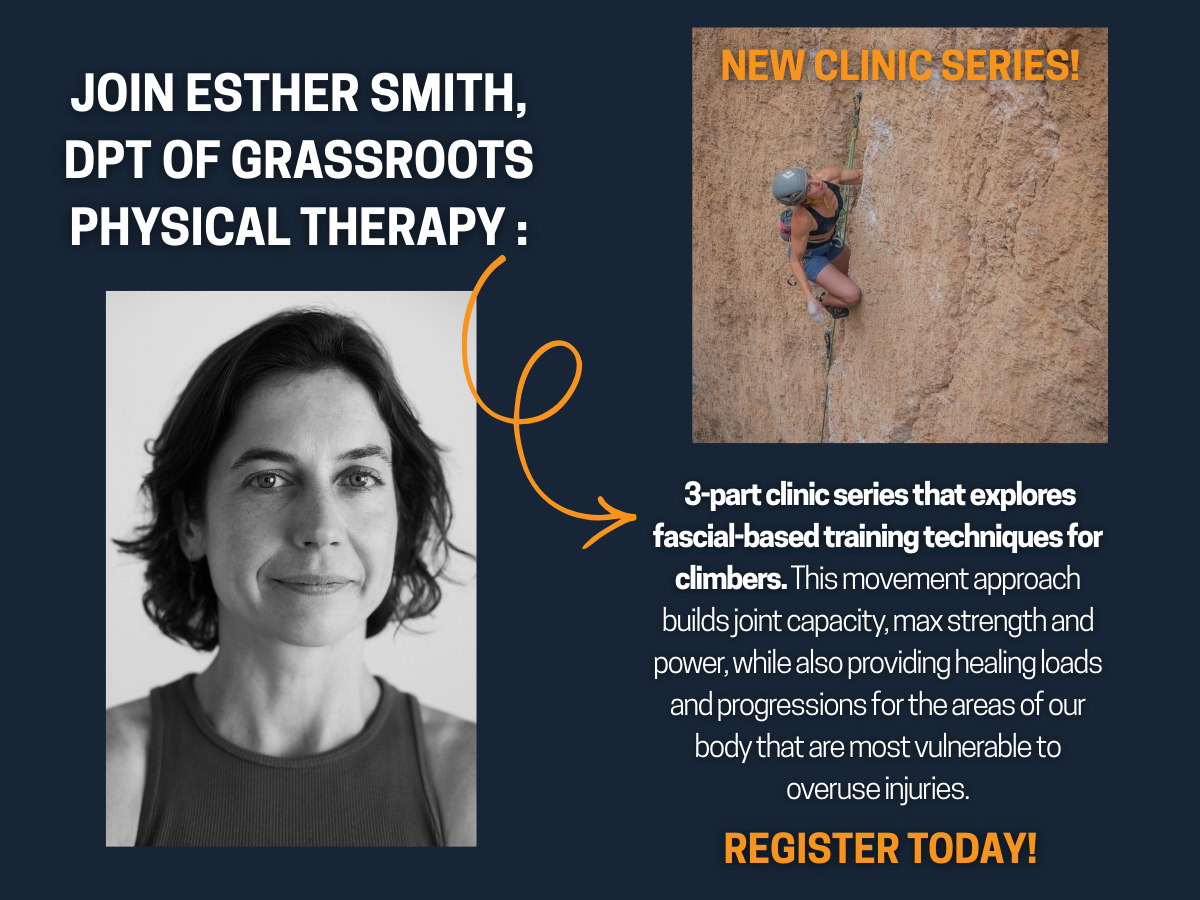Join Esther Smith, DPT of Grassroots Physical Therapy for a 3-part clinic series that explores fascial-based training techniques for climbers. This movement approach builds joint capacity, max strength and power, while also providing healing loads and progressions for the areas of our body that are most vulnerable to overuse injuries.