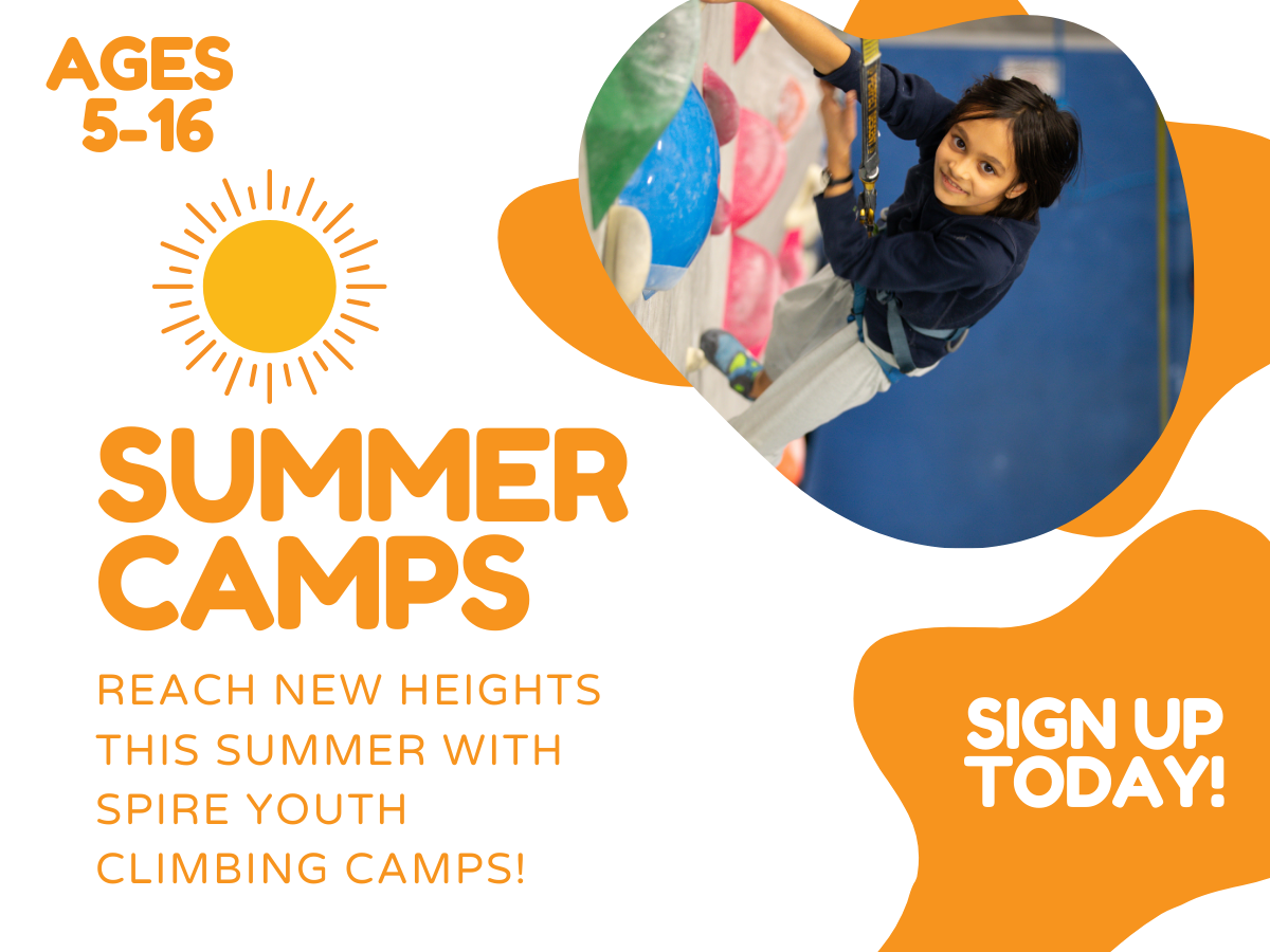 Our summer camps are a great way for children ages 5–16 to enjoy rock climbing in an fun, structured environment! In Spire's summer camps, beginners learn the essentials of the sport while kids with prior climbing experience take their skills to the next level. Our summer camps are half-day, weeklong camps, with tons of climbing time, as well as plenty of fun and games for your child. A mid-day snack keeps your child energized and ready to climb their best throughout the week. Our experienced summer camp instructors engage campers in fun and challenging activities designed to improve strength, confidence, focus, trust, and teamwork.