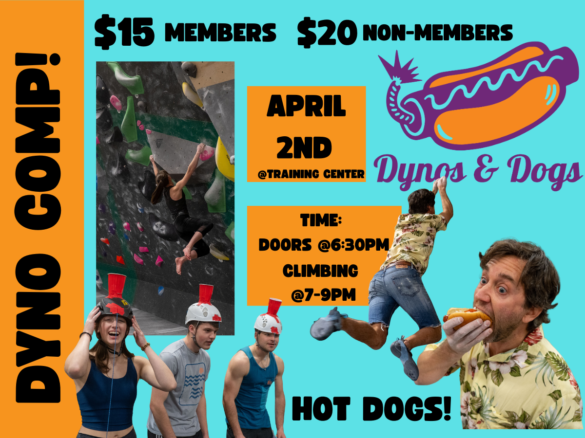 We are thrilled to announce the return of Dynos & Dogs, set to ignite the Bozeman climbing community with an exhilarating dyno competition at its Training Center location on Thursday, April 2nd at 6:30 pm. Climbers of all levels are invited to showcase their dynamic moves. As climbers reach for new heights, we ensure everyone is fueled with complimentary hot dogs. For those embracing plant-based diets, veggie dogs will also be available. The competition promises not only an adrenaline-pumping experience but also a chance to win some swag for the winners of the Men's and Women's categories.