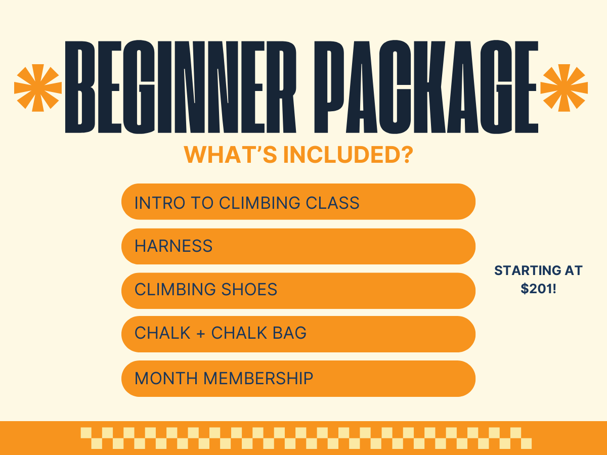 Dive into the world of climbing with our comprehensive Beginner's Climbing Package, designed to make this exhilarating sport more accessible than ever! This all-inclusive bundle equips you with everything you need to embark on your climbing journey, including climbing shoes, harness, chalk bag, and chalk. Enjoy additional perks such as a FREE 1-month membership*, Intro to Climbing class, and immediate instruction to jumpstart your skills. Plus, if you upgrade to an Autopay membership within 2 weeks after your trial ends, we'll waive the enrollment fee. With prices starting as low as $185, this package offers over $100 in savings! Get professionally fitted by our expert staff and unleash your climbing potential today. *Offer valid for non-existing members only